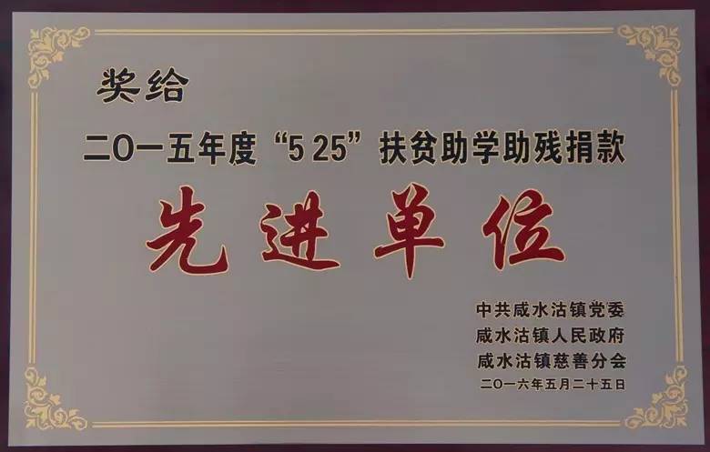 米兰milan物联获2015年度“5·25”扶贫助学助残捐款先进单位称号