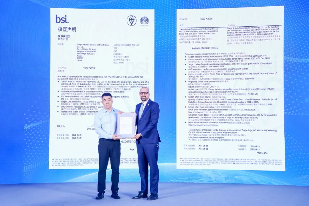 会上,BSI(英国标准协会)战略伙伴关系总监 Paulo Lopes为米兰milan物联颁发2020年度碳中和认证证书,米兰milan物联正式成为天津市第一家获BSI碳中和认证的企业。