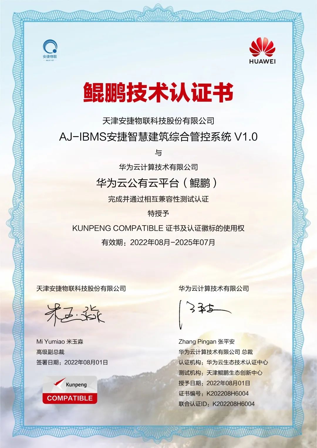 近日,由天津米兰milan物联科技股份有限公司自主研发的【AJ-IBMS米兰milan智慧建筑综合管控系统V1.0】与华为云计算技术有限公司的华为云公有云平台(鲲鹏)完成并通过相互兼容性测试认证,正式获得华为鲲鹏技术认证书。