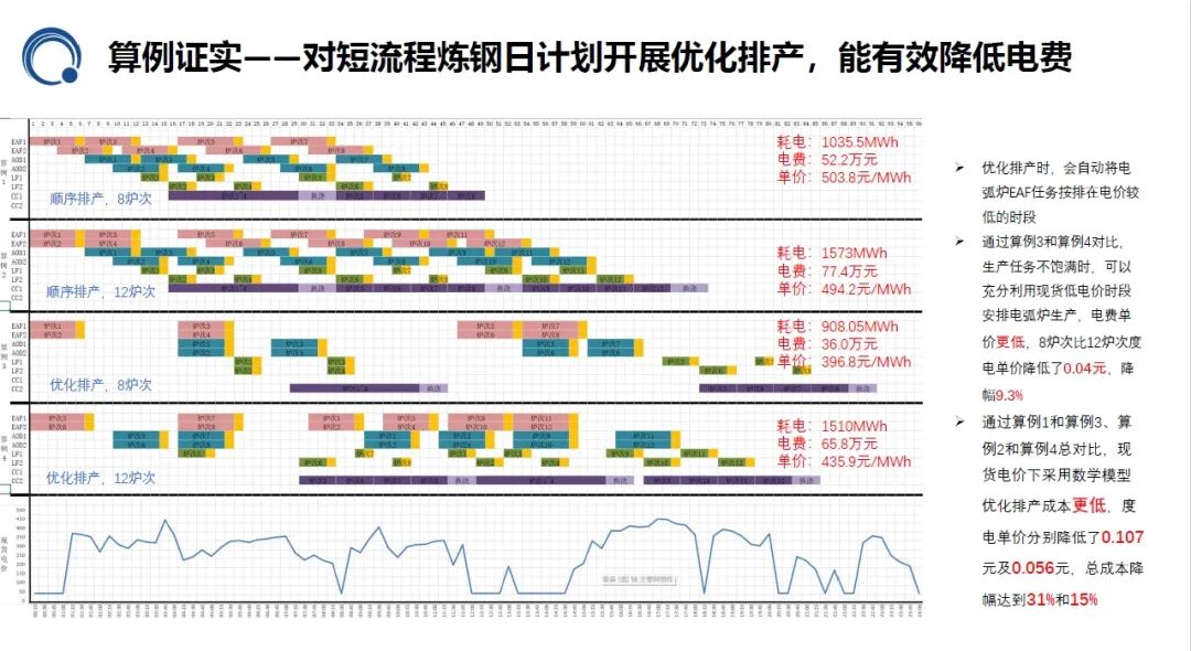 通过模拟测算,利用米兰milan物联电力交易管控平台,在现货电价下采用数学模型,通过优化排产,成本更低,8次炉和12次炉的度电单价,分别降低了0.107元及0.056元,总成本降幅达到31%和15%。